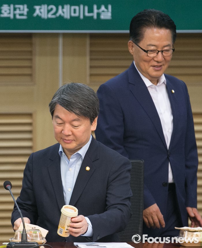 (서울=포커스뉴스) 31일 오전 서울 여의도 국회 의원회관에서 열린 국민의당 8차 정책역량강화 워크숍에 안철수(왼쪽) 상임공동대표와 박지원 원내대표가 참석하고 있다.