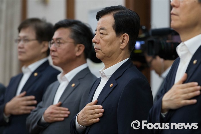 (서울=포커스뉴스) 31일 오전 서울 종로구 정부서울청사에서 열린 국무회의에 참석한 한민구(오른쪽 두 번째) 국방부 장관이 국민의례를 하고 있다.