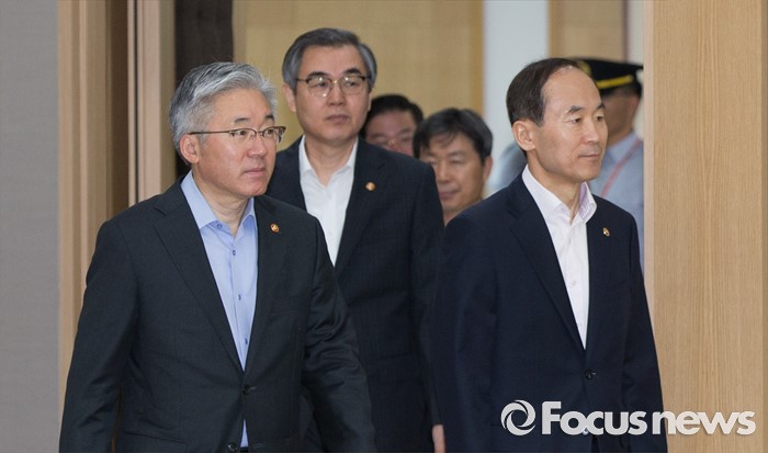 (세종=포커스뉴스) 31일 오전 세종시 정부세종청사 국무회의장에서 서울-세종 영상회의로 열린 국무회의에 국무위원들이 입장하고 있다.