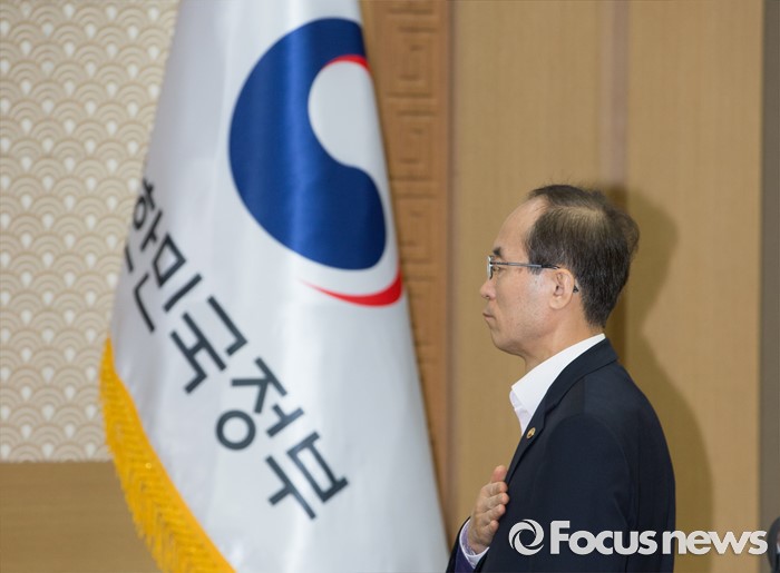 (세종=포커스뉴스) 31일 오전 세종시 정부세종청사 국무회의장에서 서울-세종 영상회의로 열린 국무회의에 참석한 윤성규 환경부 장관이 국기에 대한 경례를 하고 있다.