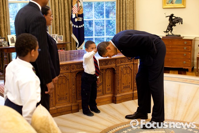 (서울=포커스뉴스) 2009년 백악관 대통령 집무실 책상 앞 야곱 필라델피아(5)가 자신 앞에서 90도로 허리를 숙이고 있는 오바마 대통령의 머리를 쓰다듬고 있다. 당시 필라델피아는 오바마 대통령에게 "당신 머리도 내 머리와 똑같은지 알고 싶어요"라고 말했고 오바마 대통령은 "그렇다면 만져봐"라고 답했다. 백악관에서 근무하던 필라델피아 부친이 백악관을 떠나면서 집무실에서 가족사진 촬영이 이뤄졌다. <사진출처=백악관 공식홈페이지 갈무리>