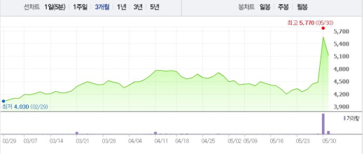 앞서 농림축산식품부와 식품의약품안전처는 29일 삼계탕의 중국 수출을 위한 정부 간 후속 절차 협의가 모두 마무리, 6월 중 수출이 시작될 것이라고 발표했다.주가흐름<사진출처=네이버 캡쳐>