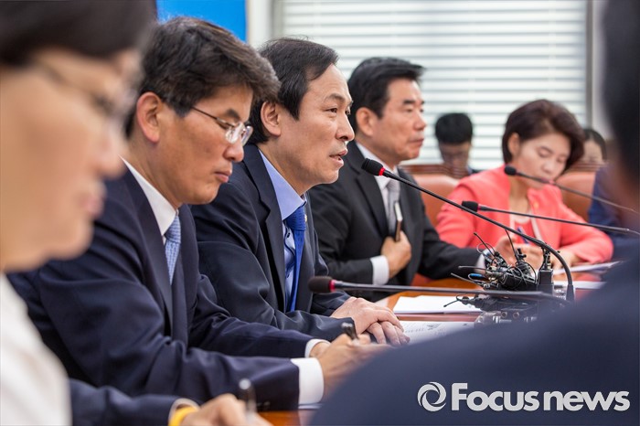 (서울=포커스뉴스) 우상호 더불어민주당 원내대표가 31일 오전 서울 여의도 국회에서 열린 원내대책회의에 참석해 모두발언 하고 있다.