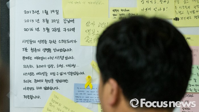 (서울=포커스뉴스) 31일 오전 서울 광진구 지하철 2호선 구의역에 스크린도어 사고로 희생된 청년을 애도하는 헌시 및 쪽지들이 붙어 있다.
