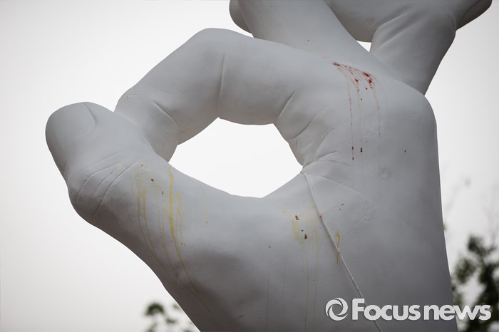 (서울=포커스뉴스) 31일 오전 서울 마포구 홍익대 정문 앞에 세워진 '일베' 상징물 조각상이 지난 밤 조형물 설치 반대 학생들이 던진 계란으로 훼손 되어 있다.