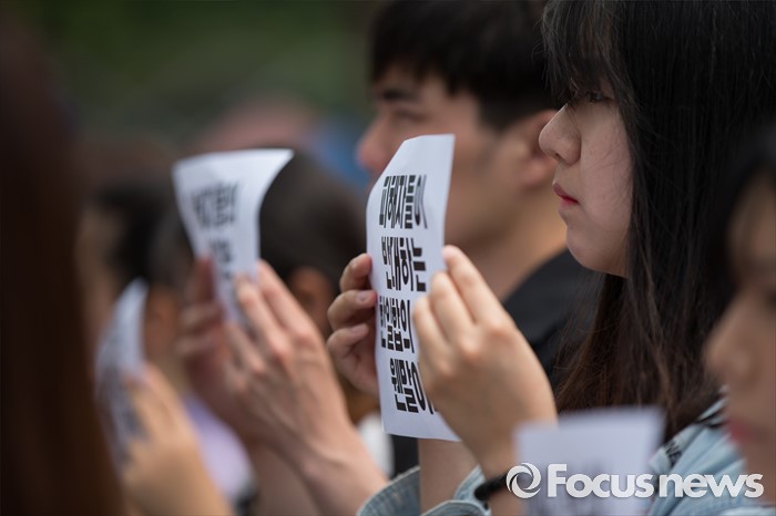 (서울=포커스뉴스) 한일 일본군위안부 합의 무효를 위한 대학생 대책위원회 학생들이 31일 오전 서울 종로구 대한민국역사박물관 앞에서 일본군위안부 피해자 의견 배제한 재단설립 강행 규탄 기자회견을 열고 있다.