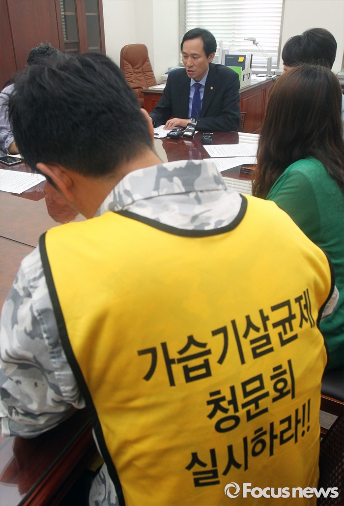 (서울=포커스뉴스) 우상호 더불어민주당 원내대표가 31일 오전 서울 여의도 국회에서 가습기 살균제 피해자 가족과 면담을 하고 있다.