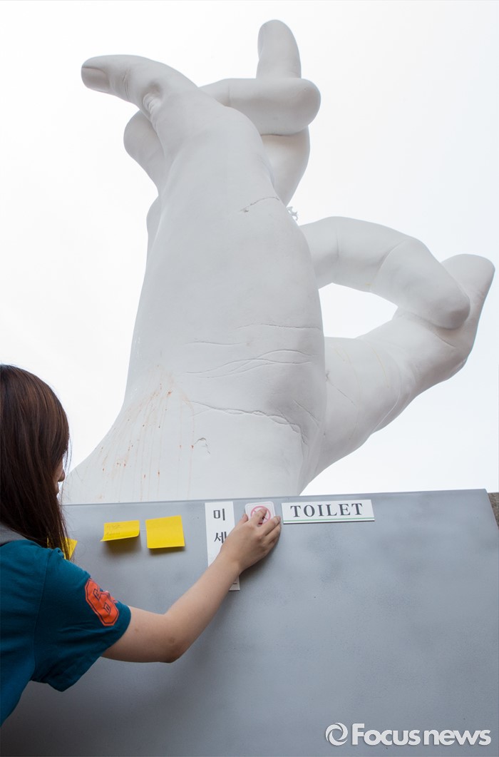(서울=포커스뉴스) 31일 오후 서울 마포구 홍익대학교 정문에 극우성향 사이트 '일베' 상징물 조각상이 설치돼 있다. 조각상은 일간베스트저장소를 상징하는 자음 'ㅇ'과 'ㅂ' 모양을 하며 회원을 인증하는 손 모양이다. '어디에나 있고, 아무데도 없다'는 제목의 이 조각상은 조소과 4학년 홍기하씨가 '환경조각연구' 수업 과제로 제작해 야외조각전에 출품한 것이다.