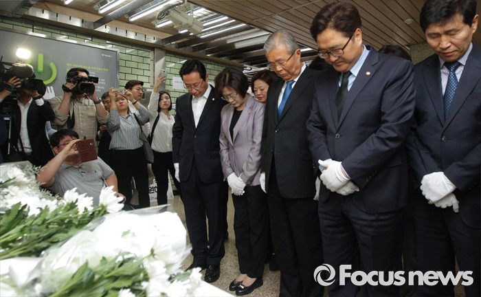 (서울=포커스뉴스) 김종인 더불어민주당 비대위 대표와 을지로위원회 소속 의원들이 31일 오후 서울 광진구 지하철 구의역 역사 내에 마련된 스크린도어 정비 작업 중 사고로 숨진 김모(19) 씨의 추모공간을 방문해 묵념을 하고 있다.