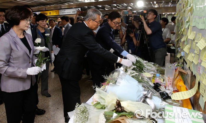 (서울=포커스뉴스) 김종인 더불어민주당 비대위 대표와 을지로위원회 소속 의원들이 31일 오후 서울 광진구 지하철 구의역 역사 내에 마련된 스크린도어 정비 작업 중 사고로 숨진 김모(19) 씨의 추모공간을 방문해 헌화를 하고 있다.