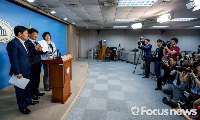(서울=포커스뉴스) 야3당 원내수석부대표들이 31일 오후 서울 여의도 국회에서 가습기 살균제 사건, 세월호특별법 제정, 어버이연합 게이트 등 현안 공조와 관련한 발표문을 들고 있다. 왼쪽부터 김관영 국민의당 원내수석부대표, 박완주 더불어민주당 원내수석부대표, 이정미 정의당 원내수석부대표.