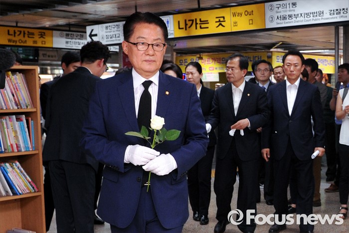 (서울=포커스뉴스) 박지원 국민의당 원내대표 등 의원들이 31일 오후 서울 광진구 지하철 구의역에서 스크린도어 정비 작업 중 사고로 숨진 김모(19) 씨의 추모공간을 방문해 헌화하고 있다.