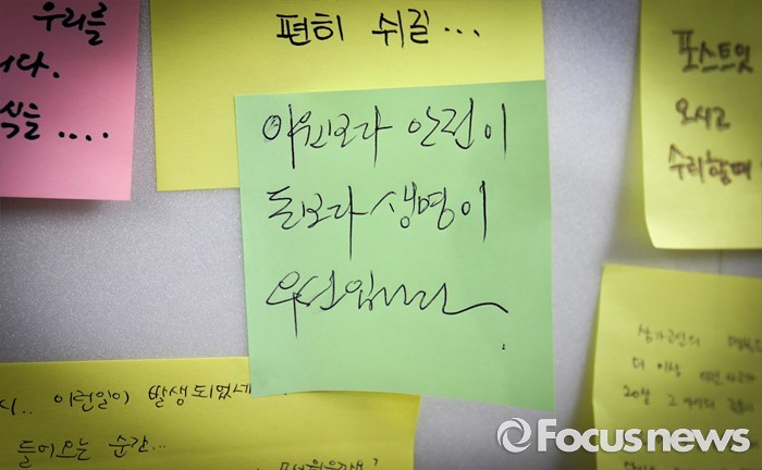 (서울=포커스뉴스) 정진석 새누리당 원내대표가 31일 오후 서울 광진구 지하철 구의역에서 스크린도어 정비 작업 중 사고로 숨진 김모(19) 씨의 추모공간을 방문해 고인을 추모하는 메모를 작성했다. 사진은 정 원내대표가 남긴 메모.