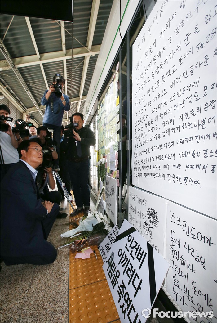 (서울=포커스뉴스) 정진석 새누리당 원내대표가 31일 오후 서울 광진구 지하철 구의역에서 스크린도어 정비 작업 중 사고로 숨진 김모(19) 씨의 사건장소를 방문해 고인을 추모하고 있다.