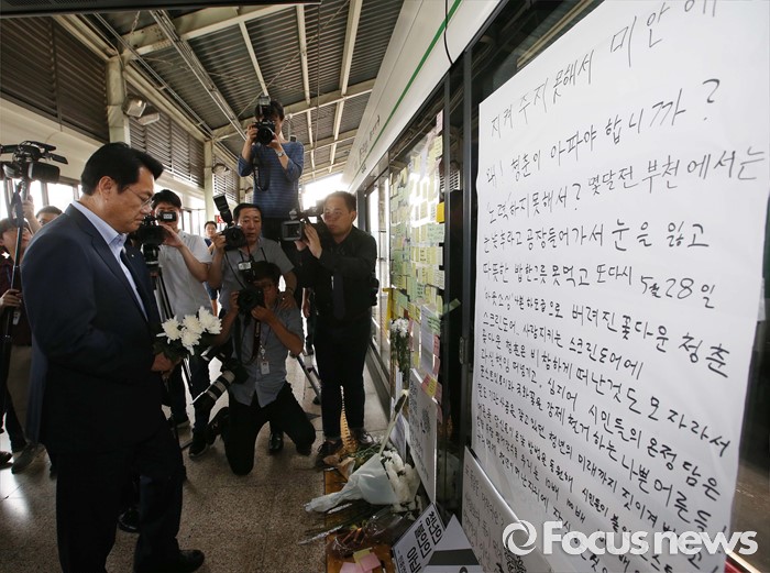 (서울=포커스뉴스) 정진석 새누리당 원내대표가 31일 오후 서울 광진구 지하철 구의역에서 스크린도어 정비 작업 중 사고로 숨진 김모(19) 씨의 사건장소를 방문해 고인을 추모하고 있다.