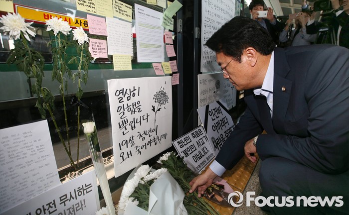 (서울=포커스뉴스) 여야를 막론한 지도부가 모든 공식 일정을 취소하고 31일 안전문을 수리하다가 끼어 숨진 김모(19)군을 추모하기 위해 서울 지하철 2호선 구의역 사고 현장을 방문했다.
