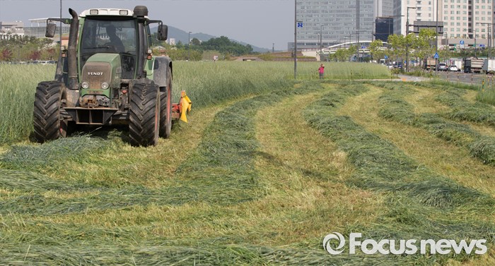 (세종=포커스뉴스) 31일 오후 세종시 정부세종청사 인근 한국토지주택공사 부지에 심은 호밀을 수확하고 있다.