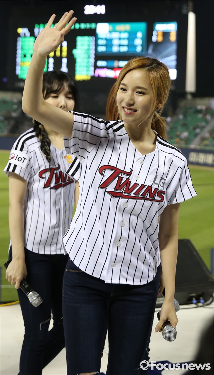 (서울=포커스뉴스) 31일 서울 잠실구장에서 열린 2016 프로야구 KIA-LG 경기에 인기 걸그룹 트와이스가 시구, 시타로 참여한뒤 경기 중간 응원단상에 올라 관중에게 노래와 춤을 선사하고 있다.