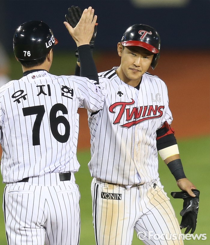 (서울=포커스뉴스) 31일 서울 잠실구장에서 열린 2016 프로야구 KIA-LG 경기 4회말 2사 만루에서 LG 정주현의 주자일소 3루타를 치고 유지현 코치와 하이파이브하고 있다.