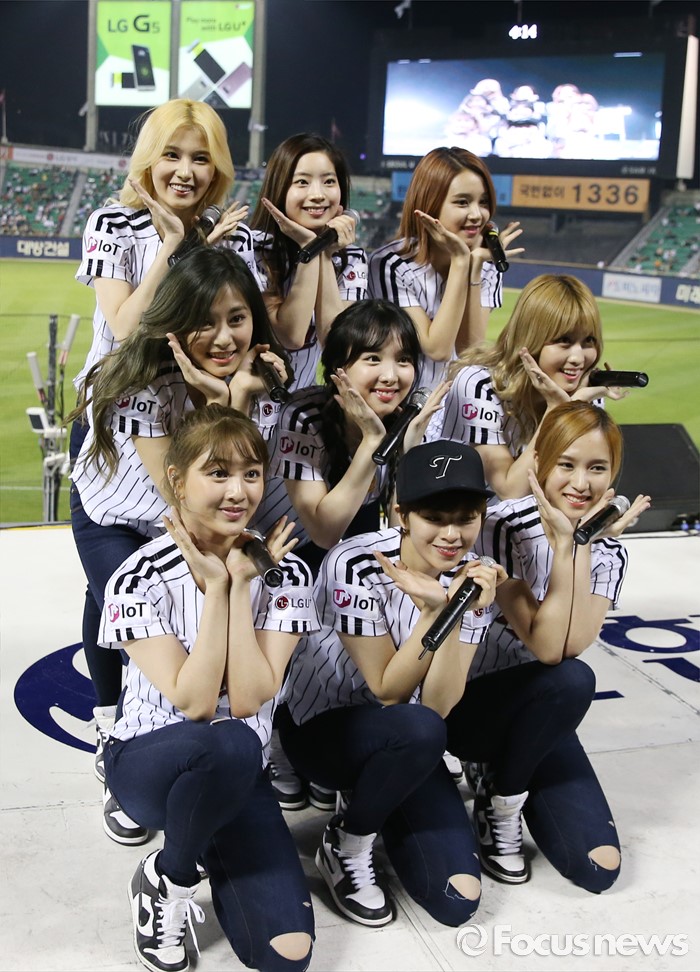 (서울=포커스뉴스) 31일 서울 잠실구장에서 열린 2016 프로야구 KIA-LG 경기에 인기 걸그룹 트와이스가 시구, 시타로 참여한뒤 경기 중간 응원단상에 올라 관중에게 노래와 춤을 선사하고 있다.