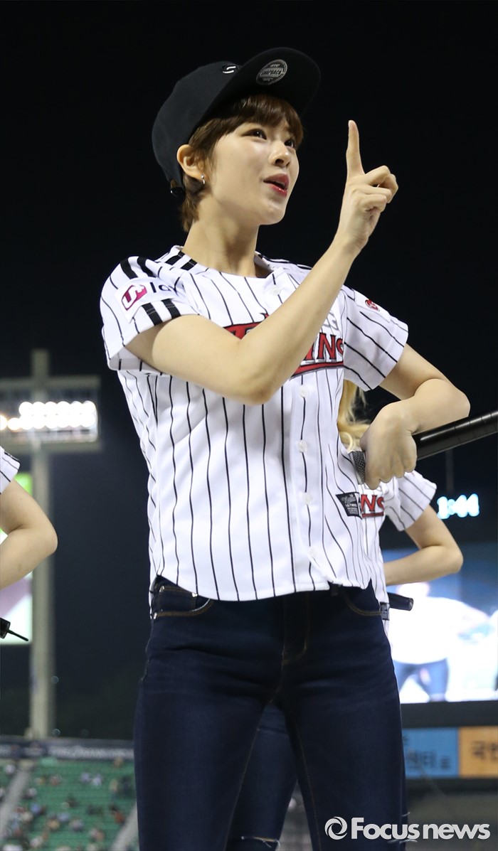 (서울=포커스뉴스) 31일 서울 잠실구장에서 열린 2016 프로야구 KIA-LG 경기에 인기 걸그룹 트와이스가 시구, 시타로 참여한뒤 경기 중간 응원단상에 올라 관중에게 노래와 춤을 선사하고 있다.