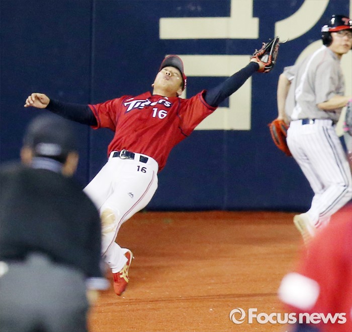 (서울=포커스뉴스) 31일 서울 잠실구장에서 열린 2016 프로야구 KIA-LG 경기 8회말 2사 1,2루에서 KIA 좌익수 김주찬이 LG 이병규의 파울플라이 볼을 뒤로 넘어지며 잡고 있다.