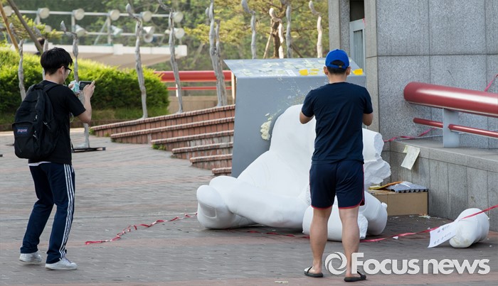 (서울=포커스뉴스) 1일 오전 서울 마포구 홍익대학교 정문에 설치된 극우성향 사이트 '일베' 상징물 조각상 파손된 채 길에 방치돼 있다. 조각상은 일간베스트저장소를 상징하는 자음 'ㅇ'과 'ㅂ' 모양을 하며 회원을 인증하는 손 모양이다. '어디에나 있고, 아무데도 없다'는 제목의 이 조각상은 조소과 4학년 홍기하씨가 '환경조각연구' 수업 과제로 제작해 야외조각전에 출품한 것이다.