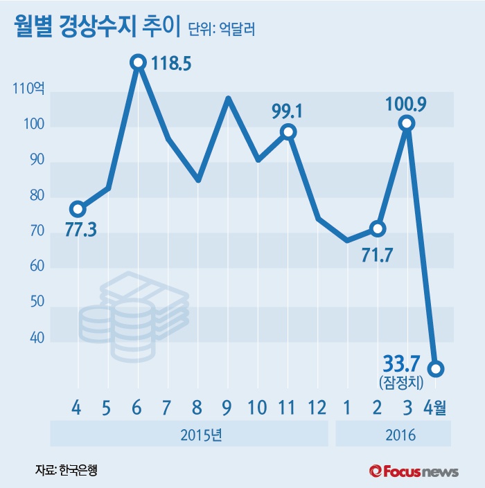(서울=포커스뉴스) 한국은행이 1일 발표한 '2016년 4월 국제수지(잠정)'를 보면 4월 경상수지 흑자 폭이 33억7천만 달러로 전월 100억9천만 달러보다 대폭 감소한 것으로 나타났다.