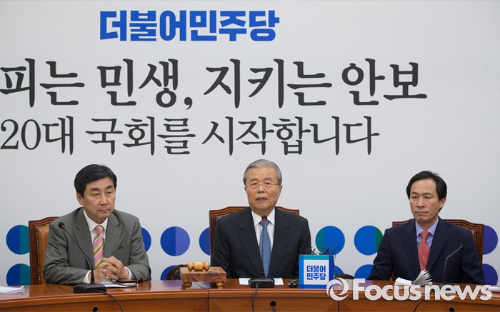(서울=포커스뉴스) 김종인(가운데) 더불어민주당 비상대책위원회 대표가 1일 오전 서울 여의도 국회에서 열린 비상대책위원회의에서 모두 발언을 하고 있다. 왼쪽부터 이종걸 전 원내대표, 김 대표, 우상호 원내대표.
