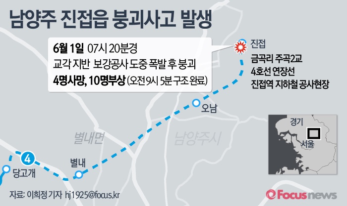 (서울=포커스뉴스) 1일 오전 7시20분께 경기도 남양주시 진접읍 금곡리 지하철 4호선 연장선 진접역지하철 공사현장이 붕괴해 근로자 4명이 숨지고 10명이 부상당했다.