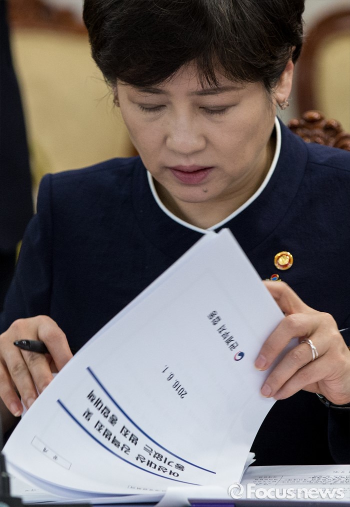 (서울=포커스뉴스) 1일 오전 서울 종로구 정부서울청사에서 열린 법질서관계장관회의에 참석한 강은희 여상가족부 장관이 여성대상 강력범죄 및 동기없는 범죄 종합대책에 대한 자료를 살펴보고 있다.