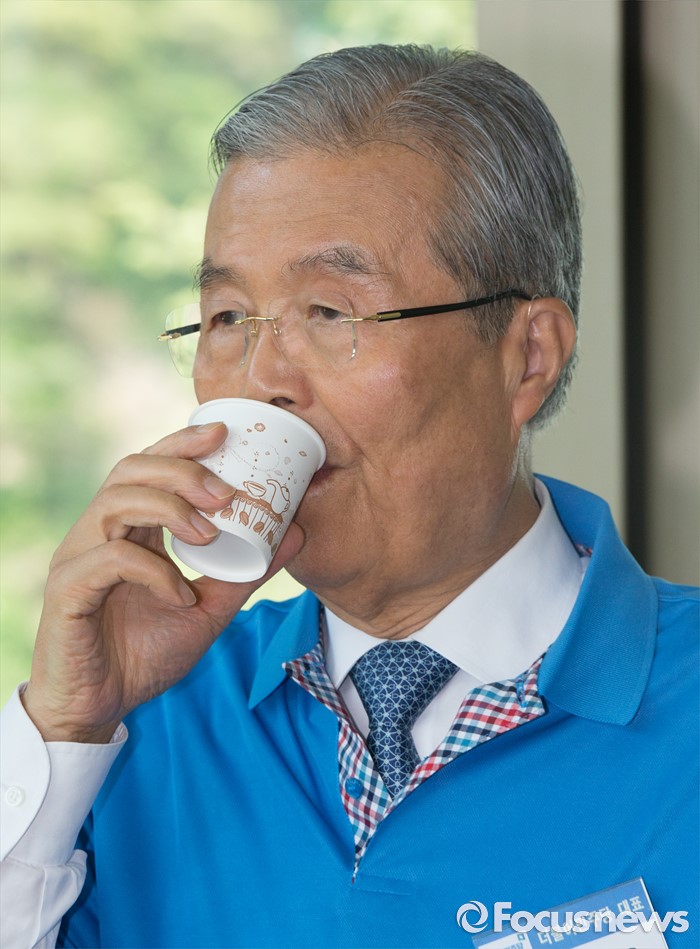 (괴산=포커스뉴스) 김종인 더불어민주당 비대위 대표가 1일 오후 충북 괴산 성불산자연휴양림에서 열린 충북도당 핵심당직자 워크숍에 참석, 총선 출마자 간담회에서 목을 축이고 있다.