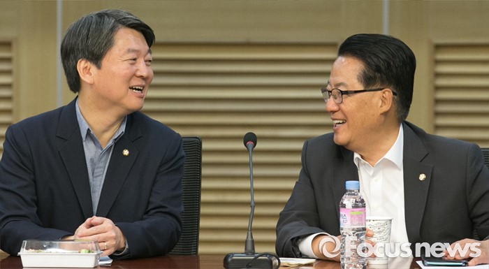 (서울=포커스뉴스) 2일 오전 서울 여의도 국회 의원회관에서 열린 국민의당 정책역량강화 집중 워크숍에 참석한 안철수(왼쪽) 상임공동대표와 박지원 원내대표가 대화하고 있다.