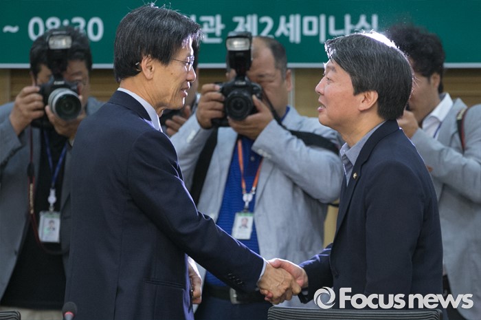 (서울=포커스뉴스) 2일 오전 서울 여의도 국회 의원회관에서 열린 국민의당 정책역량강화 집중 워크숍에 참석한 안철수(오른쪽) 상임공동대표가 강연자로 나선 윤영관 전 외교통상부 장관과 인사하고 있다.