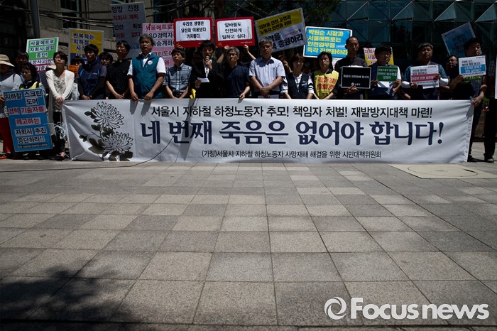 (서울=포커스뉴스) 2일 오전 서울 중구 서울시청 정문 앞에서 '서울시 지하철 하청노동자 사망재해 해결을 위한 시민대책위원회(가칭)'가 지하철 2호선 구의역 사고에 대한 책임자 처벌과 대책마련을 촉구하며 기자회견을 하고 있다.