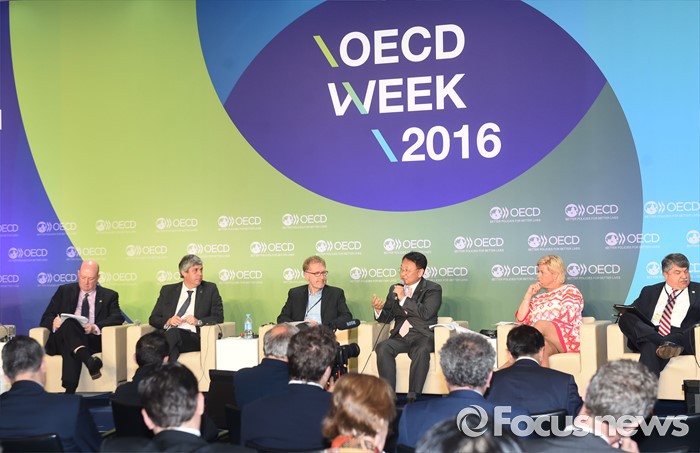 (서울=포커스뉴스) 유일호 부총리 겸 기획재정부 장관이 1일 프랑스 파리 OECD에서 열린 '2016년 OECD 각료이사회'에 참석, 고위급 패널토론에서 주제인 '성장을 위한 새로운 과제'와 관련 토론하고 있다. <사진제공=기획재정부>