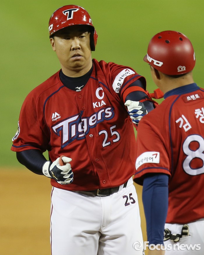 (서울=포커스뉴스) 1일 서울 잠실구장에서 열린 2016 프로야구 KIA-LG 경기 6회초 무사 1,3루에서 KIA 이범호가 1타점 좌전 안타를 치고 1루에서 김창희 코치의 축하를 받고 있다.