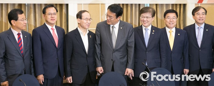 (서울=포커스뉴스) 2일 오전 서울 여의도 국회 귀빈식당에서 열린 미세먼지 대책 관련 당정협의에 참석한 의원들과 장, 차관들이 취재진을 향해 포즈를 취하고 있다. 왼쪽부터 이현재, 이명수 의원, 윤성규 환경부 장관, 정진석 원내대표, 최양희 미래창조과학부 장관, 김광림 정책위의장, 이석준 국무조정실장.
