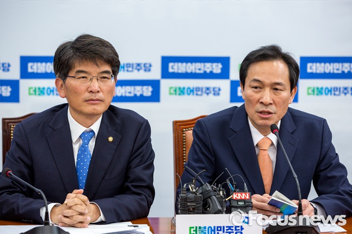 (서울=포커스뉴스) 우상호(오른쪽) 더불어민주당 원내대표가 2일 오전 서울 여의도 국회에서 열린 정책조정회의에 참석해 모두발언 하고 있다.