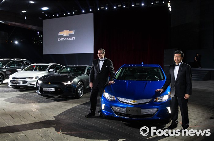 (부산=포커스뉴스) 1일 오후 부산 해운대구 우동에 위치한 영화의 전당에서 열린 GM 프리미어 나이트에서 한국 지엠의 제임스 김(오른쪽) CEO와 데일 설리번 부사장이 신차 볼트(VOLT) 앞에서 포즈를 취하고 있다.