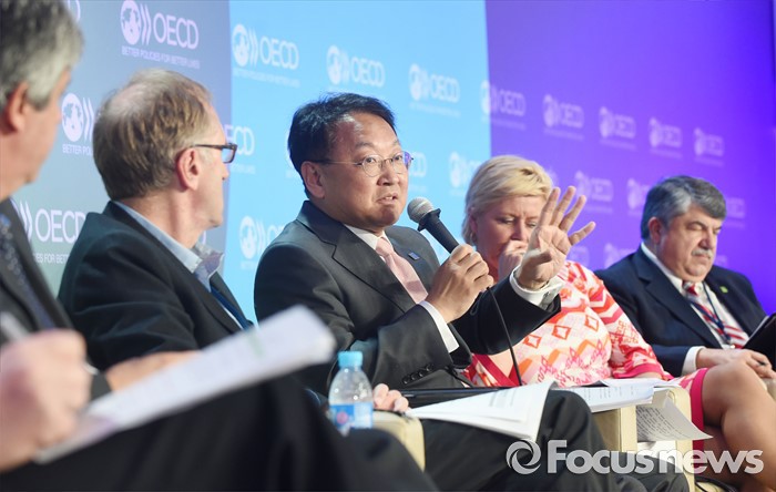 (서울=포커스뉴스) 유일호 부총리 겸 기획재정부 장관이 1일 프랑스 파리 OECD에서 열린 '2016년 OECD 각료이사회'에 참석, 고위급 패널토론에서 주제인 '성장을 위한 새로운 과제'와 관련 토론하고 있다. <사진제공=기획재정부>