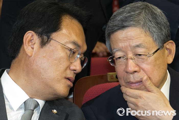 (서울=포커스뉴스) 2일 오후 서울 여의도 국회 의원회관에서 열린 새누리당 4차 전국위원회에 참석한 정진석(왼쪽) 원내대표와 공식 선출된 김희옥 혁신비대위원장이 대화하고 있다.