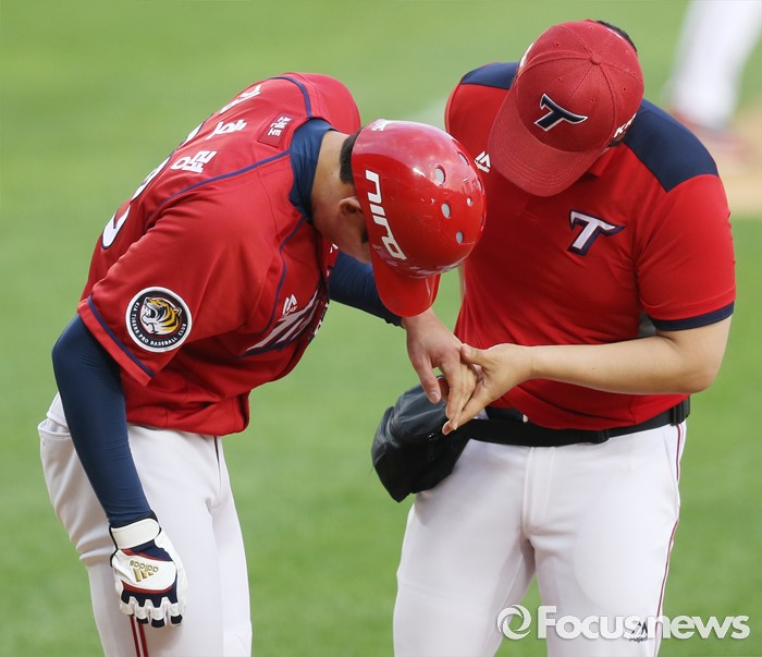 (서울=포커스뉴스) 1일 서울 잠실구장에서 열린 2016 프로야구 KIA-LG 경기에서 3회초 LG 투수 코프랜드의 투구에 왼손을 맞은 KIA 김호령이 트레이너의 치료를 받고 있다.