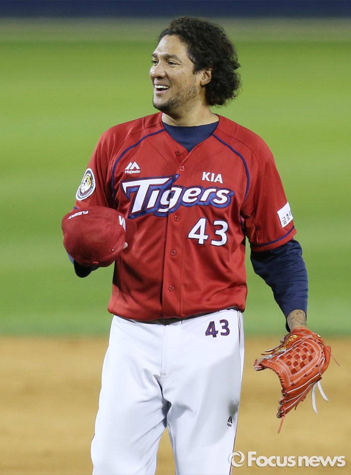 (서울=포커스뉴스) 1일 서울 잠실구장에서 열린 2016 프로야구 KIA-LG 경기에서 KIA 투수 헥터가 7회말 LG 오지환을 중견수 플라이로 아웃시키고 모자를 벗어 들고 활짝 웃고 있다.