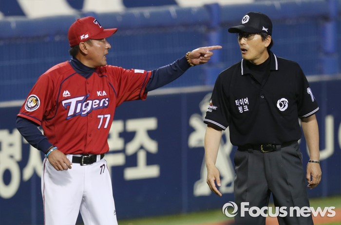 (서울=포커스뉴스) 1일 서울 잠실구장에서 열린 2016 프로야구 KIA-LG 경기 5회말 2사 1루에서 KIA 김기태 감독이 김광회 3루심에게 강하게 항의하고 있다.