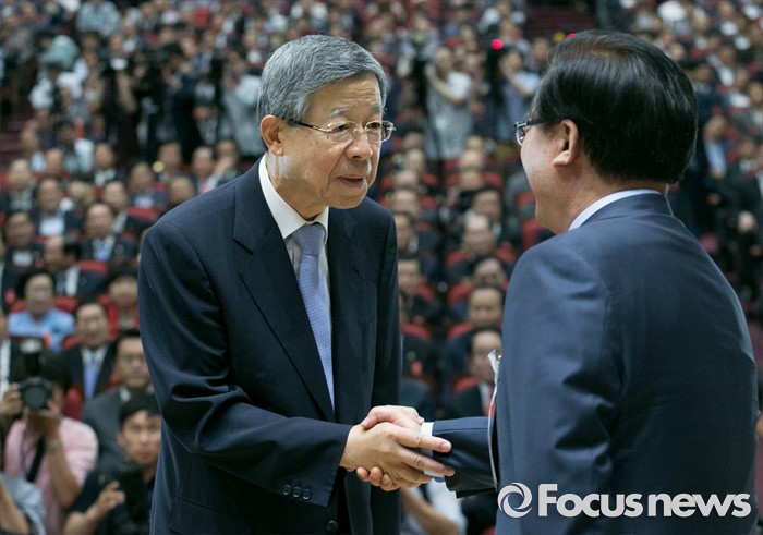 (서울=포커스뉴스) 2일 오후 서울 여의도 국회 의원회관에서 열린 새누리당 4차 전국위원회에서 공식 선출된 김희옥(왼쪽) 혁신비대위원장과 정갑윤 신임 전국위의장이 악수하고 있다.