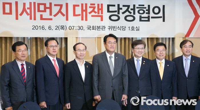 이날 당정협의에는 당에서 정진석 원내대표, 김광림 정책위의장, 김상훈 정책위부의장, 이명수 민생특위 위원장, 정운청 부위원장, 이현재 의원 등이 참석했으며, 정부 측에서는 윤성규 환경부 장관과 최양희 미래창조과학부 장관, 이석준 국무조정실장, 최상목 기획재정부 제1차관, 이관섭 산업통상자원부 제1차관, 최정호 국토교통부 제2차관 등이 나왔다.2일 오전 서울 여의도 국회 귀빈식당에서 열린 미세먼지 대책 관련 당정협의에 참석한 의원들과 장, 차관들이 취재진을 향해 포즈를 취하고 있다. 왼쪽부터 이현재, 이명수 의원, 윤성규 환경부 장관, 정진석 원내대표, 최양희 미래창조과학부 장관, 김광림 정책위의장, 이석준 국무조정실장. 2016.06.02 박동욱 기자 2일 오전 서울 여의도 국회 귀빈식당에서 열린 미세먼지 대책 관련 당정협의에 참석한 정진석 새누리당 원내대표가 모두발언을 하고 있다. 2016.06.02 박동욱 기자