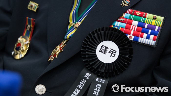 (대전=포커스뉴스) 2일 오전 대전 유성구 국립대전현충원에서 6.25 전쟁 전사자 발굴유해 3위(位) 합동안장식에 참석한 참전용사 가슴에 근조리본이 달려 있다.