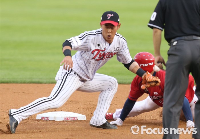 (서울=포커스뉴스) 1일 서울 잠실구장에서 열린 2016 프로야구 KIA-LG 경기에서 3회초 1사후 LG 3루수 히메네스의 에러로 진루한 KIA 이진영이 김호령 타석때 2루 도루를 시도해 세이프되고 있다. 볼이 빠지면서 이진영은 3루까지 진루.