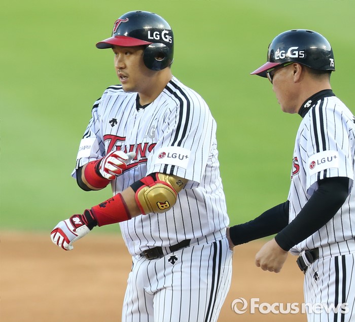 (서울=포커스뉴스) 2일 서울 잠실구장에서 열린 2016 프로야구 KIA-LG 경기 2회말 1사 2,3루에서 LG 유강남이 중견수 실책으로 타점을 올리고 1루에서 한혁수 코치의 축하를 받고 있다.